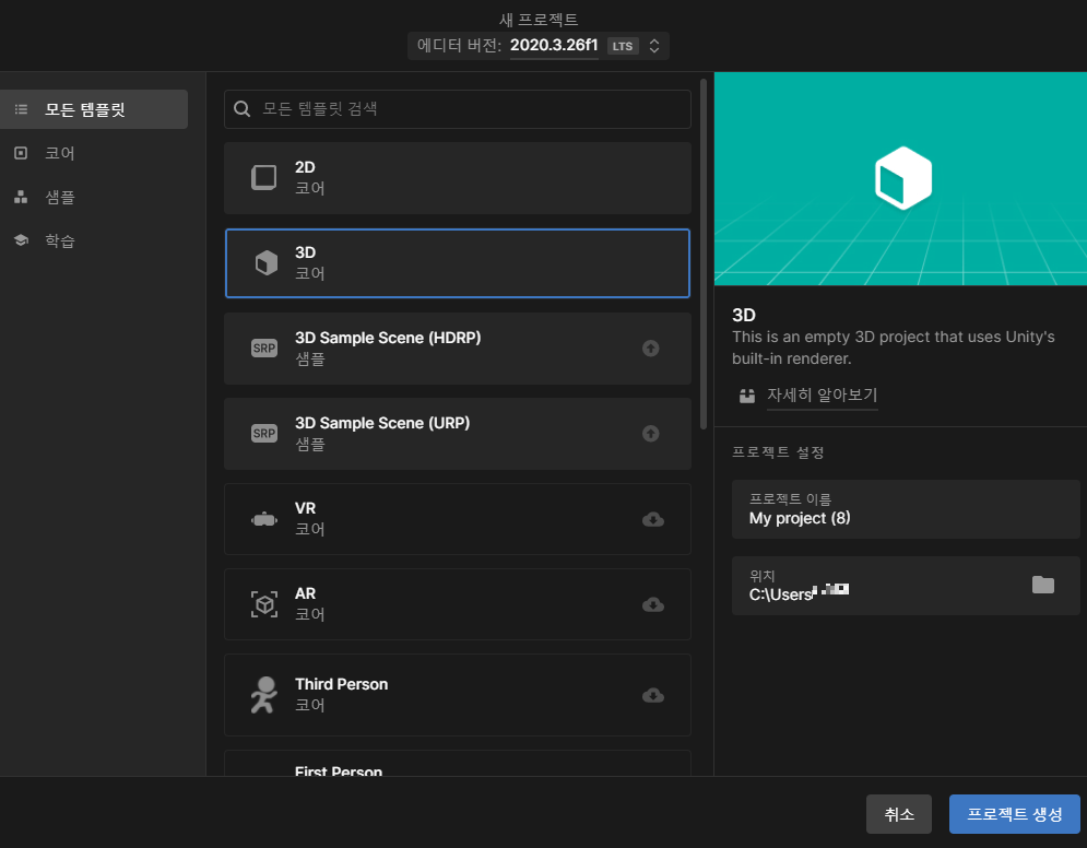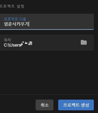 프로젝트가 저장되는 기본 위치는 사용자 폴더이나, 원하면 바꿔도 된다.