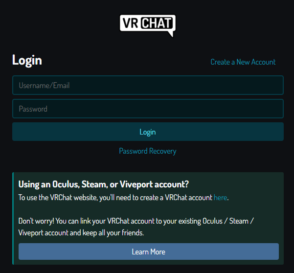 브챗 계정이 있으면 그걸로 로그인하면 되고, 만약 본인이 스팀이나 오큘러스, 바이브로 가입했다면 VRChat 계정을 만들어서 연동해야 한다. Create a New Account를 눌러서 시키는 대로 해서 계정을 만들어주자.