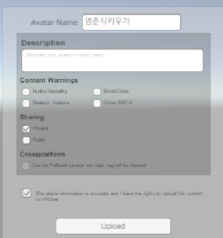 아바타 이름을 기입하고 맨 밑에 박스를 클릭해서 체크표시하고 업로드를 누른다.