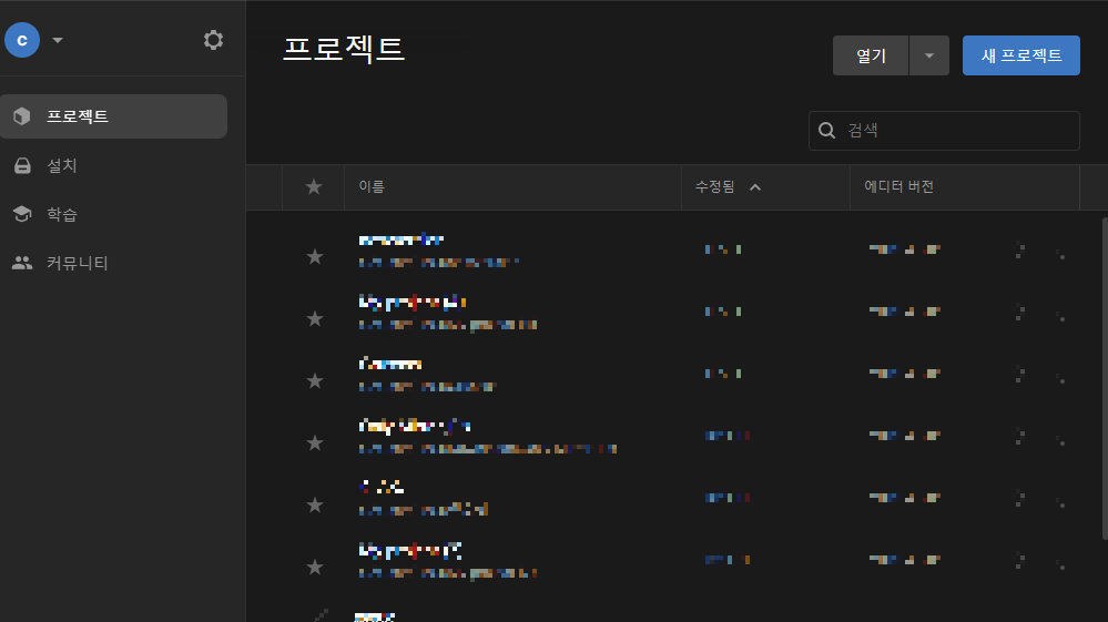 모자이크된 부분은 내 프로젝트들이다. 유니티를 이전에 사용해본 적이 있다면 비어있는 게 정상이다.