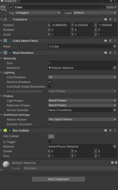 다음은 그 오른쪽의 인스펙터 창이다. 여기에는 각각 오브젝트들의 물적사항들이 적혀있다.