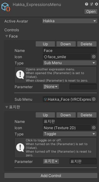 메뉴 혹은 서브메뉴 - 마음대로 해도 된다 - 에다가 Add Control을 해서 종류는 Toggle로 하고, 파라미터를 아까 추가한 것으로 해준다. 그 외의 이름이나 아이콘은 원하는대로 하자.