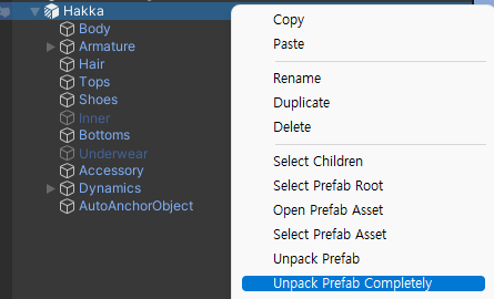 프리팹의 대가리를 우클릭해서 Unpack Prefab Completely를 눌러 포장을 열어주자.