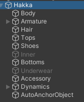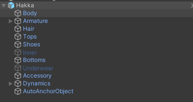아바타의 하이어라키 구조는 일단 텍스쳐 메쉬들이 있고, Armature 안에 있는 오브젝트들이 이것들이 움직이는 뼈대 역할을 한다. Hips, 즉 엉덩이 부분이 맨 상위로 가고, 양 다리(Upper Leg로 시작하는 것), 허리(Spine)로 나눠지고, 허리 안에는 가슴(Chest), 그리고 가슴에서는 목(Neck)과 양 어깨/팔(Shoulder로 시작하는 것)이 있고, 목 안에는 머리(Head)이 있다, 다리는 Upper Leg(허벅지부터)-Lower Leg(무릎 아래부터)-Foot(발)-Toe(발끝) 순의 구조고, 팔은 Shoulder(어깨부터)-Upper Arm(어깨 아래부터)-Lower Arm(팔꿈치 아래부터)-Hand(손)-각종 손가락들이 있다.
