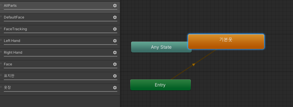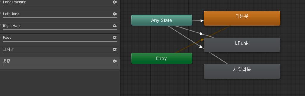 입힐 옷별로 스테이트를 만들어주고 하늘색 Any State를 우클릭해서 Make Transition으로 각 스테이트에 연결해준다.