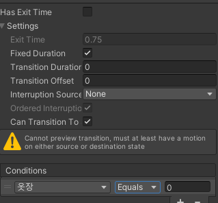 각 스테이트로 가는 트랜지션(하얀 화살표)를 클릭해서 인스펙터 창에서 Exit time은 끄고, Duration은 0으로 하고, Conditions는 옷장에 쓸 Int 파라미터를 찾아서 Equals [숫자]로 하면 된다.