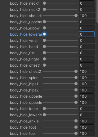 100으로 되어있는 부위 숨기기 쉐이프키 중 줄일 필요 없는 것들을 0으로 만든다. 쉐이프키 이름은 아바타마다 천차만별이나, 일반적으로 부위_shrink 혹은 부위_hide이다.