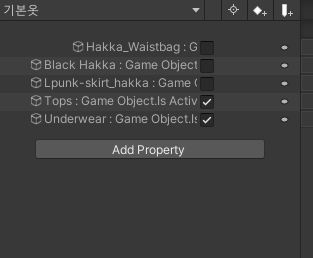애니메이션 창에서 새 애니메이션을 만들어주고 녹화해서 n가지 옷들 중 하나만 켜지게 하자. 꺼진 채여도 모든 옷들이 들어가야 한다. 몸을 줄이는 쉐이프키가 들어가야 한다면 넣자.