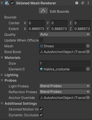 아바타 기본 옷의 메쉬 렌더러 컴포넌트다. 이것도 아바타마다 케바케겠지만 이 아바타의 경우에는 바디. 옷, 신발 등의 설정값이 똑같다.
